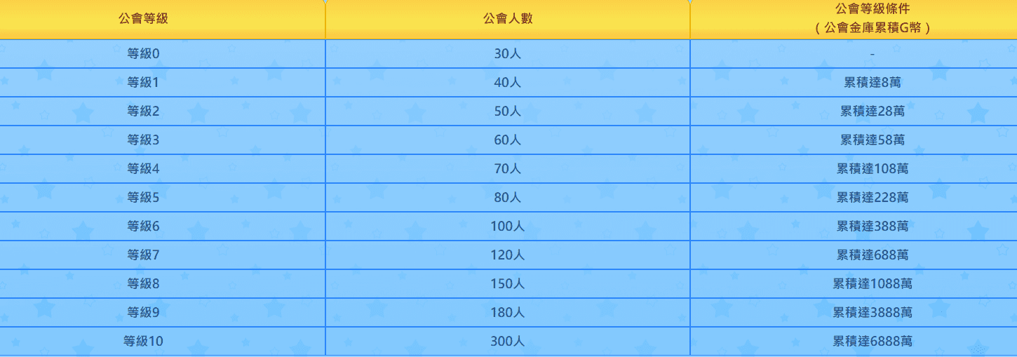 當公會累積G幣達到條件時,將會依照表格晉升等級、提高公會可加人數。